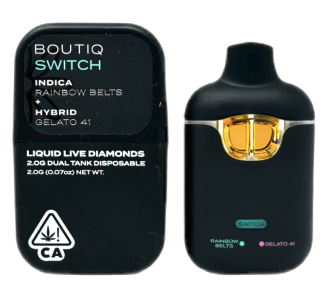 Boutiq V2 Rainbow Belts and Gelato Disposable includes the powerful Rainbow Belts strain, an indica-dominant hybrid created by crossing Zkittlez and Moonbow. It features a 70/30 indica-to-sativa ratio and typically tests around 24% THC, offering a heavy yet enjoyable body high.